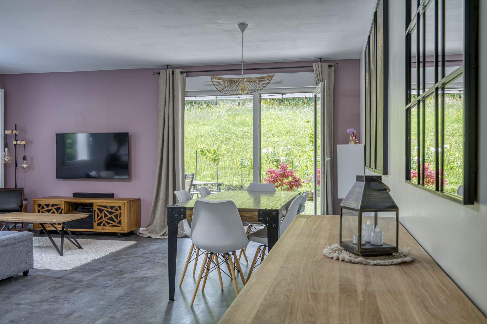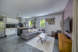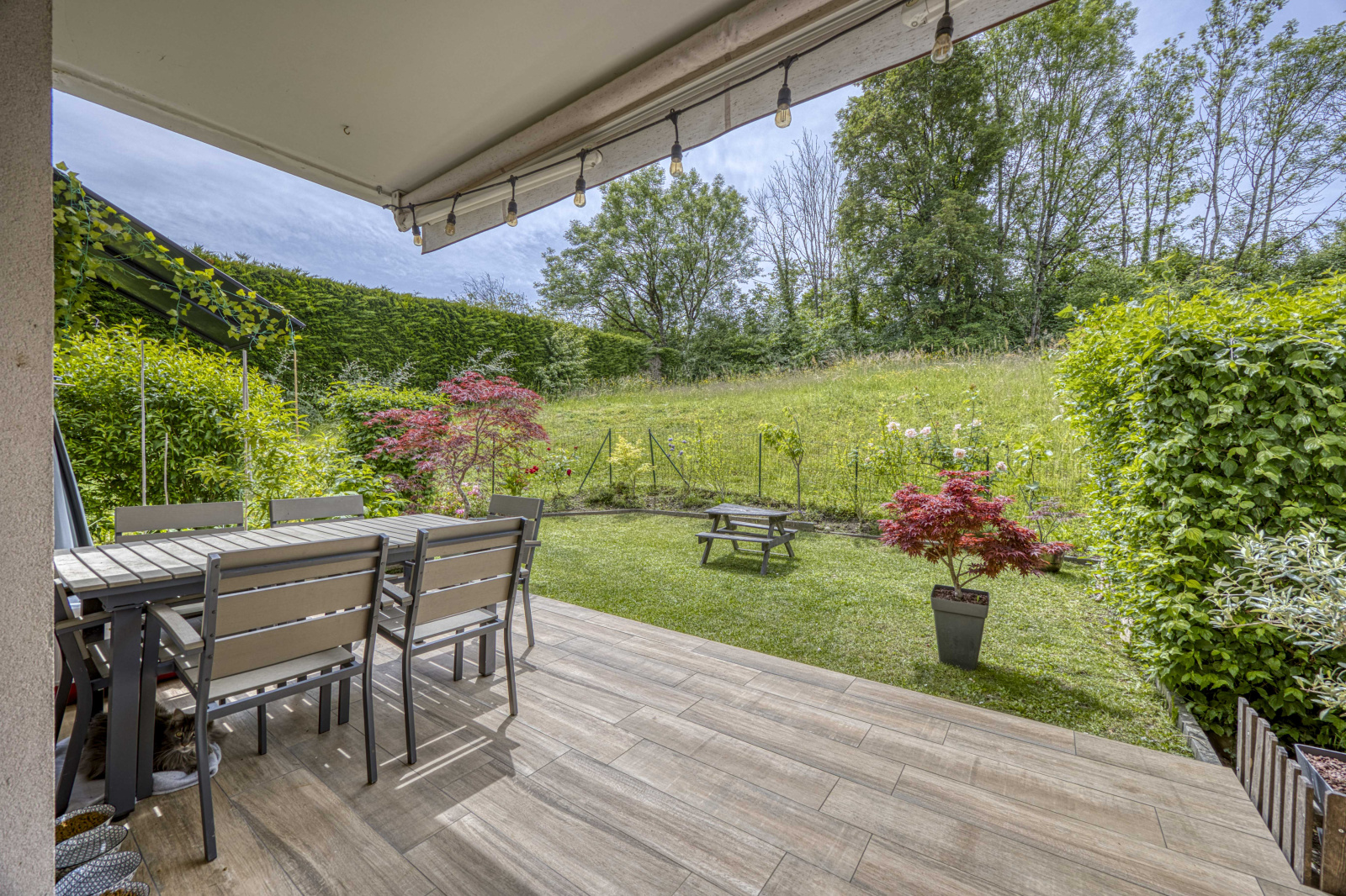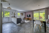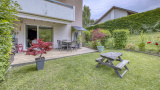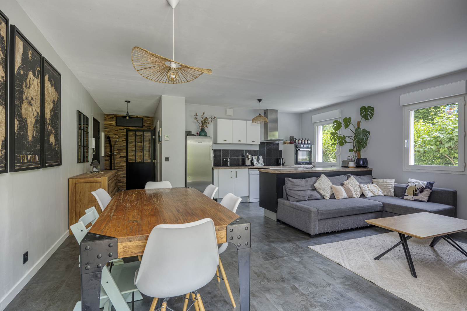 La visite se poursuit par une très belle pièce de vie lumineuse d’environ 34 m² comprenant un espace cuisine entièrement équipée et un coin salon-salle à manger s’ouvrant sur une terrasse prolongée d’une pelouse de 68 m² sans vis-à-vis. Ce bel extérieur arboré, exposé plein sud offre une vue dégagée sans vis-à vis sur la verdure.