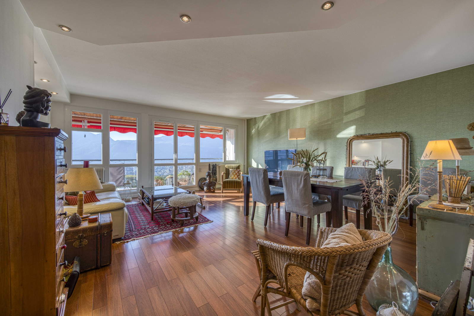 La porte d'entrée franchie, vous découvrirez une entrée avec grand placard intégré donnant sur une très belle pièce à vivre baignée de lumière s’ouvrant sur un balcon de 13 m² offrant une vue exceptionnelle sur la ville, le lac et les montagnes.